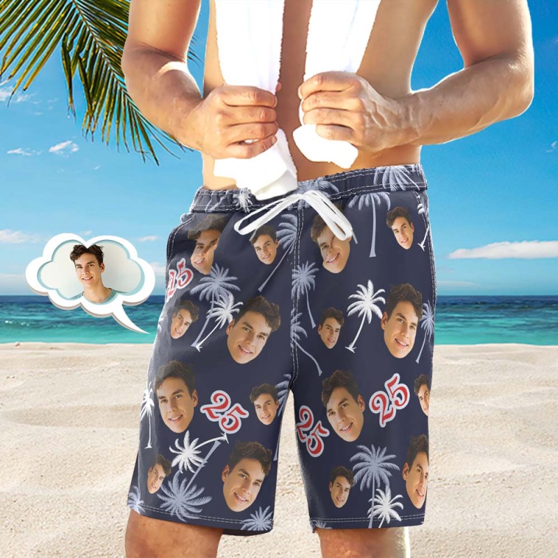 Home / Custom Face And Number Birthday Beach Shorts Red And White Coconut Tree Beach Trunks
