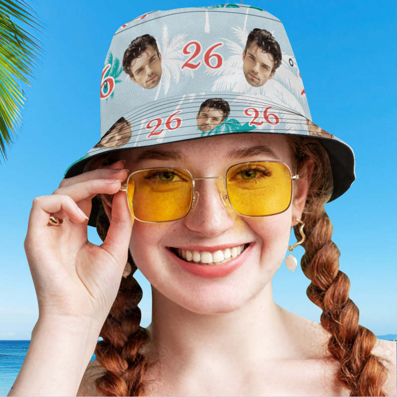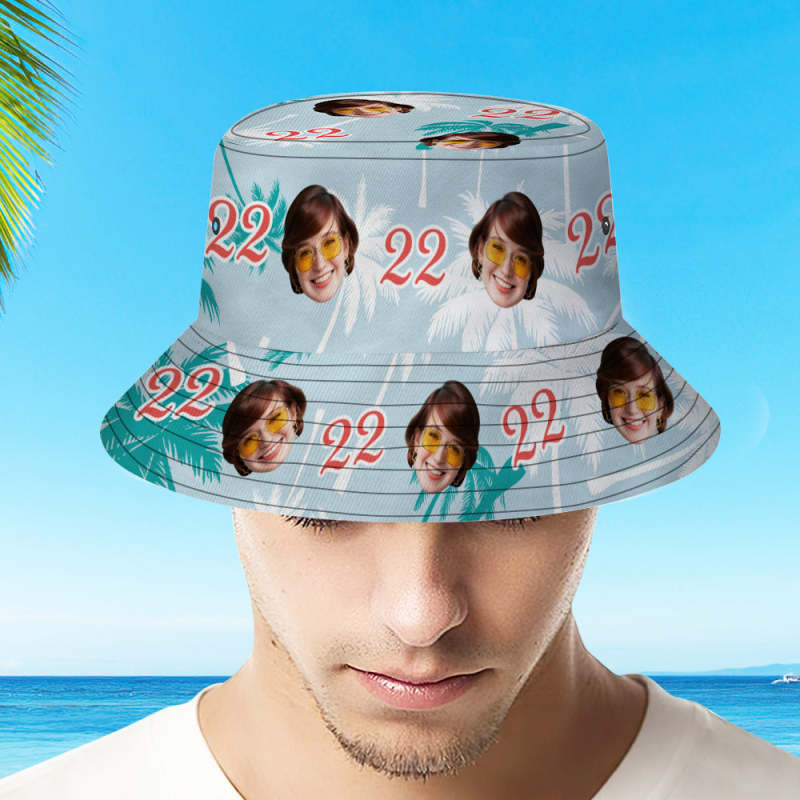 Home / Custom Face And Number Birthday Bucket Hat Red And White Coconut Tree Hat
