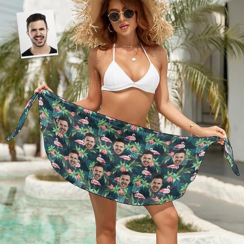 Custom Face Beach Wrap Women Short Sarongs - Flamingo Flowers And Leaves