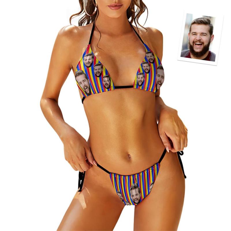 Custom Face Swimming Suit Sexy Strappy Bikini Rainbow Stripes
