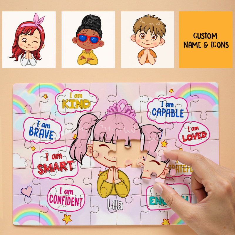Kids Custom Jigsaw Puzzle | Self-affirmation "I Am Smart" with Name for Boys & Girls | Girls in Rainbow & Boys in Rocket and Universe Design