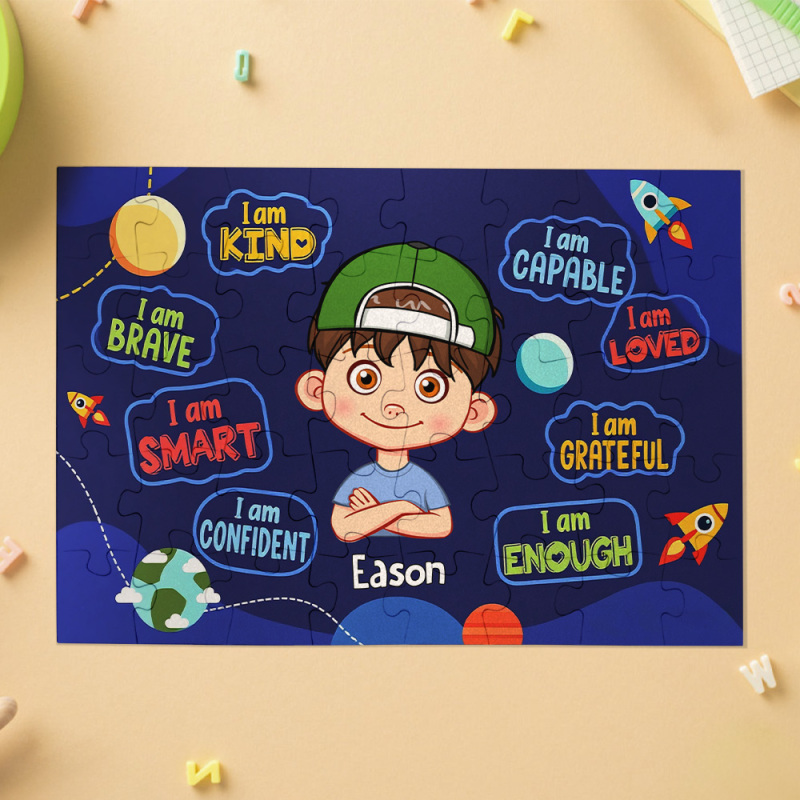 Home / Kids Custom Jigsaw Puzzle | Self-affirmation "I Am Smart" with Name for Boys & Girls | Girls in Rainbow & Boys in Rocket and Universe Design